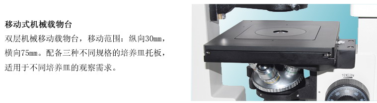 雙層機械移動載物臺,移動范圍:縱向30mm,橫向75mm。